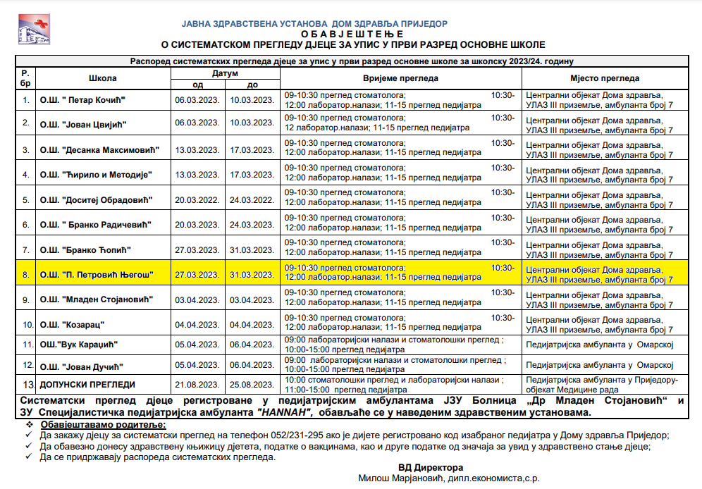 Обавјештење о систематском прегледу дјеце за упис у први разред основне школе