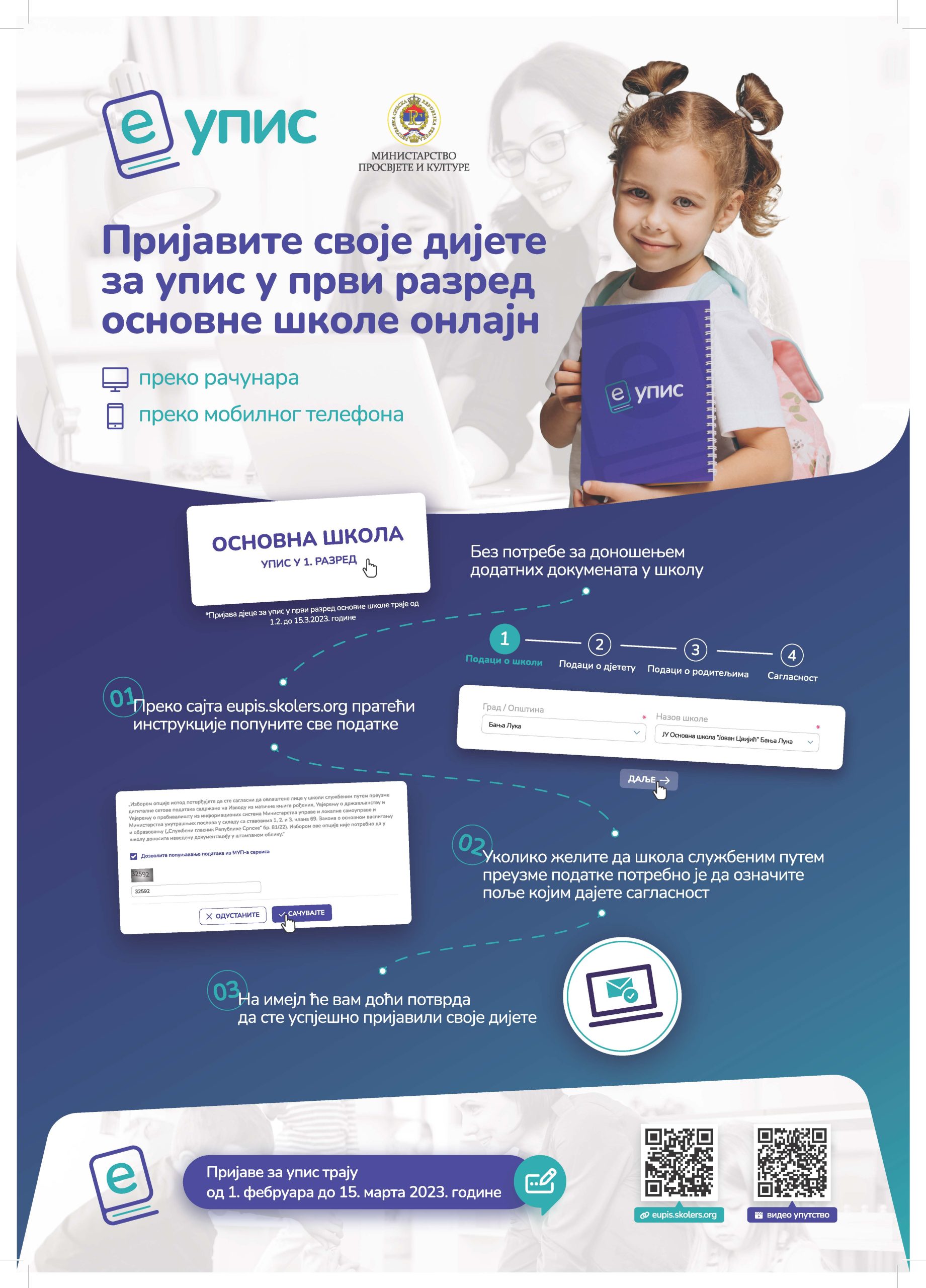 Пријава дјеце траје од 01.02. до 15.03.2023. године. Молимо Вас да, уколико имате дијете дорасло за упис у први разред, на овај начин извршите пријаву те ће Вам сам поступак уписа дјетета бити олакшан.