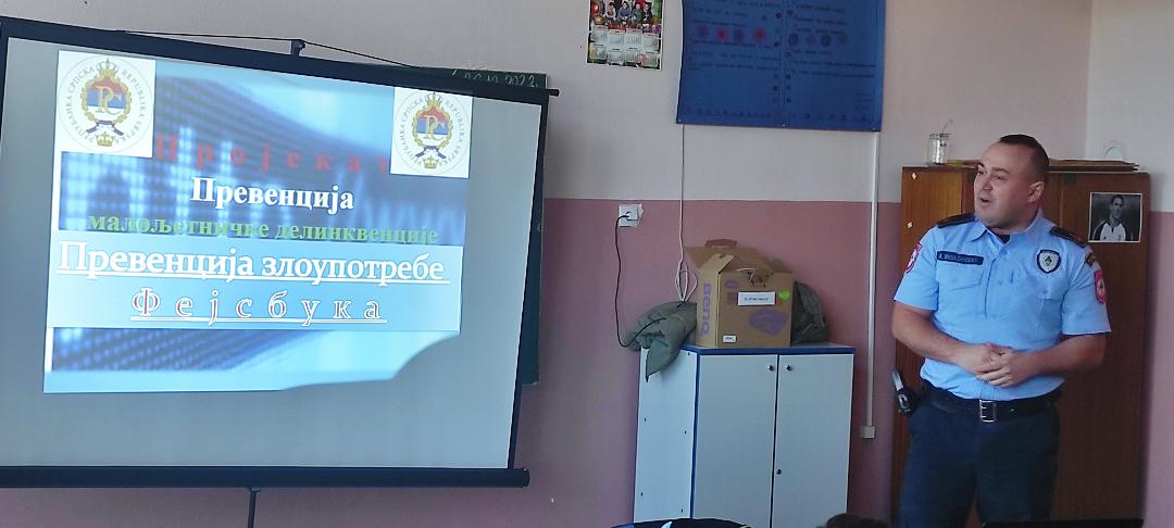 Дана, 26.12.2022. године представник МУП-а, Александар Миладиновић је ученицима предметне наставе одржао предавање на тему „Превенција злоупотребе фејсбука“.